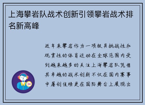 上海攀岩队战术创新引领攀岩战术排名新高峰