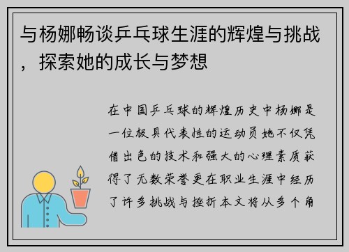 与杨娜畅谈乒乓球生涯的辉煌与挑战,探索她的成长与梦想